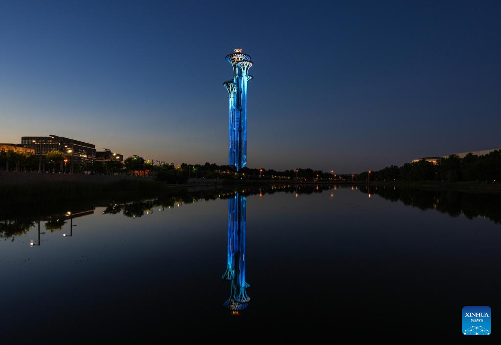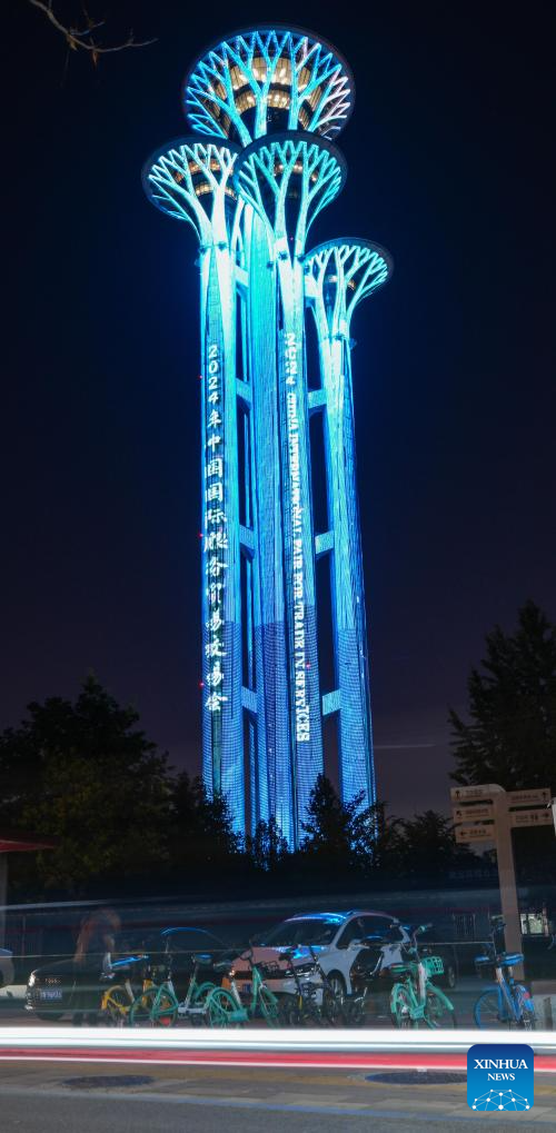BEIJING, 12 septiembre, 2024 (Xinhua) -- La Torre Olímpica de Beijing es iluminada durante la Feria Internacional de Comercio de Servicios de China 2024 (CIFTIS, por sus siglas en inglés), en Beijing, capital de China, el 12 de septiembre de 2024. (Xinhua/Chen Yehua)