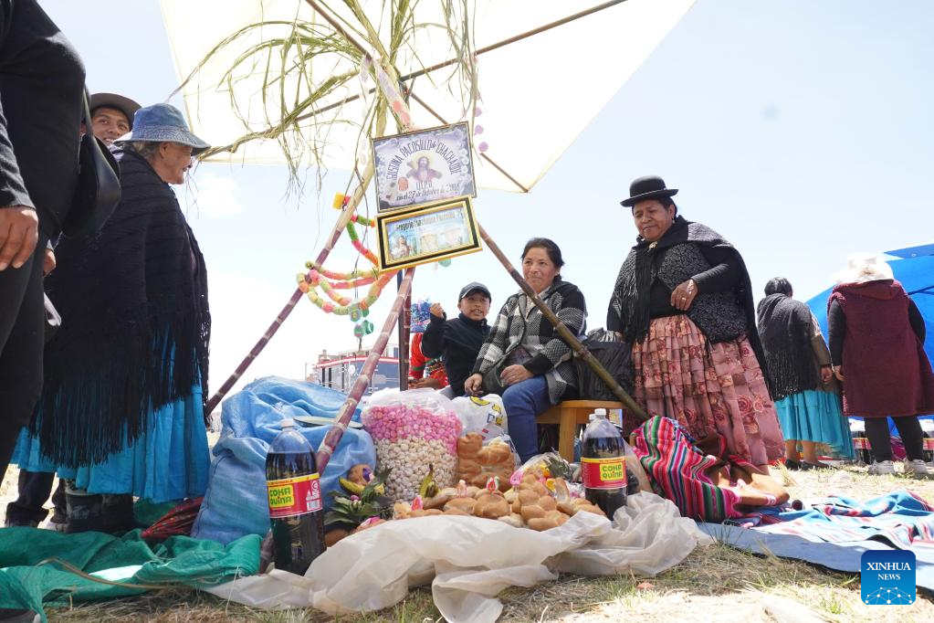 EL ALTO, 2 noviembre, 2025 (Xinhua) -- Una mujer indígena coloca una ofrenda en la tumba de su familiar en el marco de las celebraciones de Todos Santos, en la ciudad de El Alto, Bolivia, el 2 de noviembre de 2025. (Xinhua/Javier Mamani)