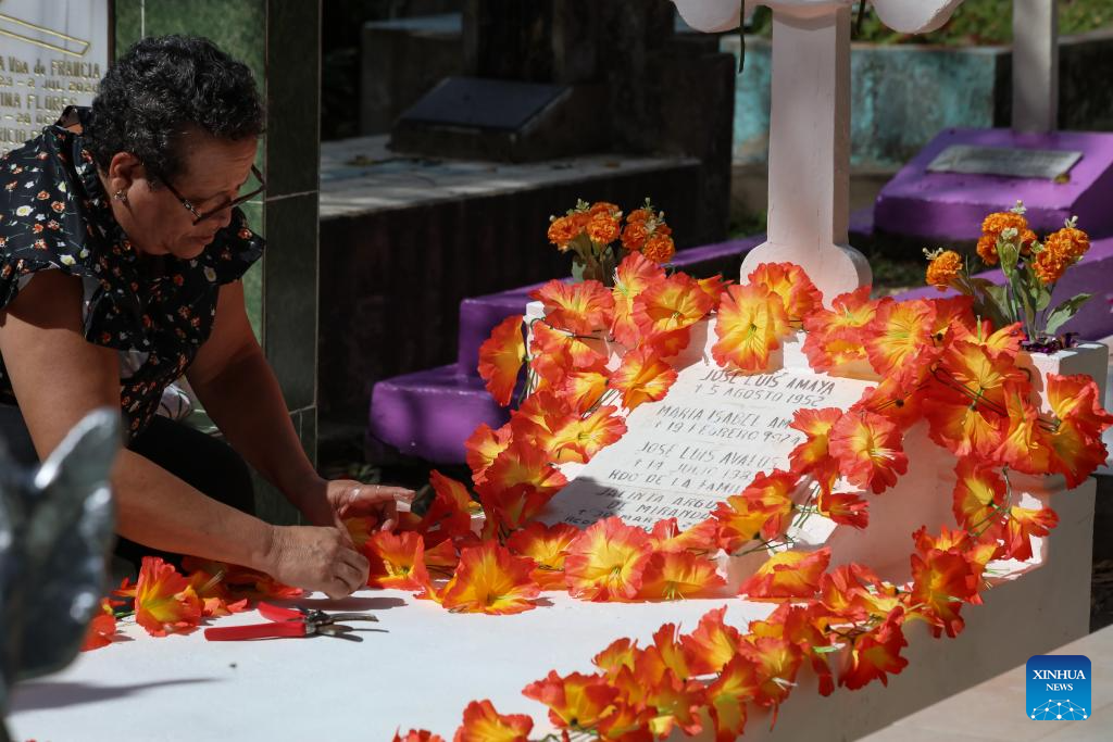 SAN SALVADOR, 2 noviembre, 2025 (Xinhua) -- Una mujer adorna una tumba con flores durante la conmemoración del Día de los Difuntos en el Cementerio de Los Ilustres, en el departamento de San Salvador, capital de El Salvador, el 2 de noviembre de 2025. (Xinhua/Alexander Peña)