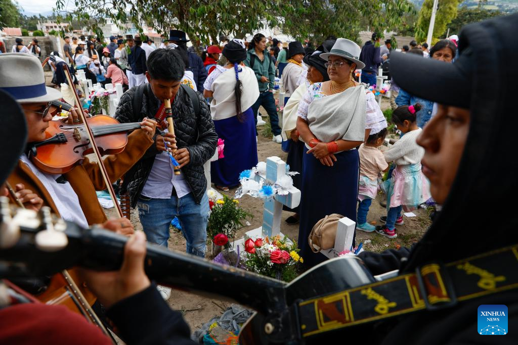 IMBABURA, 2 noviembre, 2025 (Xinhua) -- Músicos interpretan melodías tradicionales indígenas durante el Día de los Difuntos en el cementerio de Cotacachi, en la provincia de Imbabura, en el norte de Ecuador, el 2 de noviembre de 2025. (Xinhua/Ricardo Landeta)
