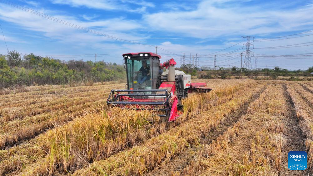 BEIJING, 3 noviembre, 2025 (Xinhua) -- Vista aérea tomada con un dron de un agricultor cosechando arroz en un campo, en la ciudad de Hefei, en la provincia de Anhui, en el este de China, el 3 de noviembre de 2025. Para el 30 de octubre, se ha cosechado más del 90 por ciento de los cereales de otoño y se ha sembrado más del 25 por ciento del trigo de invierno en todo el país. (Xinhua/Chen Sanhu)