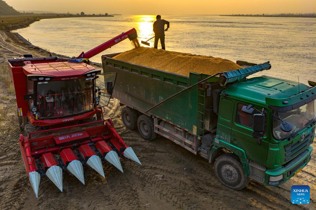 BEIJING, 3 noviembre, 2025 (Xinhua) -- Vista aérea tomada con un dron del 2 de noviembre de 2025 de maíz cosechado cargado en un camión, en la ciudad de Sanmenxia, en la provincia de Henan, en el centro de China. Para el 30 de octubre, se ha cosechado más del 90 por ciento de los cereales de otoño y se ha sembrado más del 25 por ciento del trigo de invierno en todo el país. (Xinhua/Du Jie)