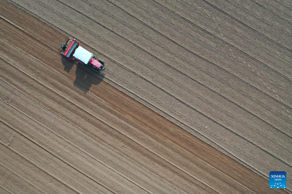 BEIJING, 3 noviembre, 2025 (Xinhua) -- Vista aérea tomada con un dron de un agricultor sembrando trigo en un campo, en la ciudad de Linyi, en la provincia de Shandong, en el este de China, el 3 de noviembre de 2025. Para el 30 de octubre, se ha cosechado más del 90 por ciento de los cereales de otoño y se ha sembrado más del 25 por ciento del trigo de invierno en todo el país. (Xinhua/Zhang Chunlei)