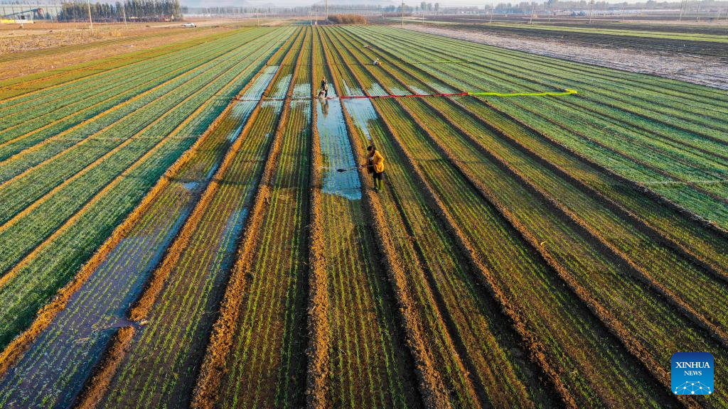 BEIJING, 3 noviembre, 2025 (Xinhua) -- Vista aérea tomada con un dron de agricultores regando un campo de trigo, en la ciudad de Zunhua, en la provincia de Hebei, en el norte de China, el 3 de noviembre de 2025. Para el 30 de octubre, se ha cosechado más del 90 por ciento de los cereales de otoño y se ha sembrado más del 25 por ciento del trigo de invierno en todo el país. (Xinhua/Liu Mancang)