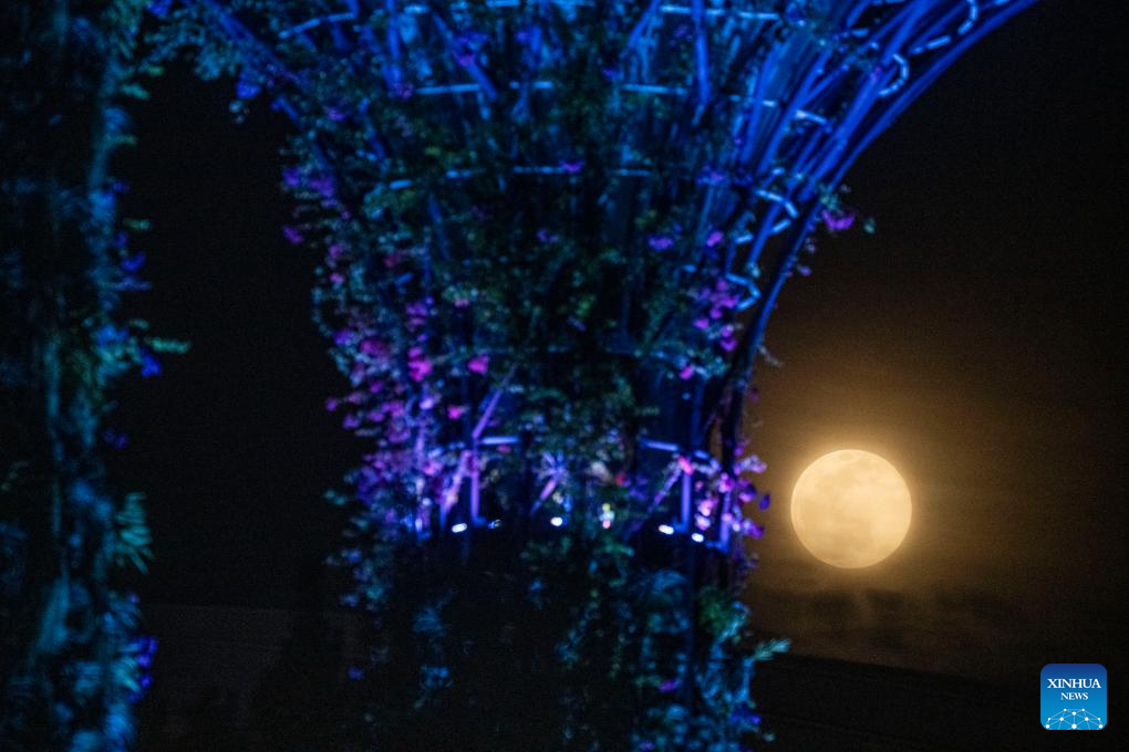 SINGAPUR, 5 noviembre, 2025 (Xinhua) -- La luna llena es vista sobre los Jardines de la Bahía, en Singapur, el 5 de noviembre de 2025. (Xinhua/Then Chih Wey)