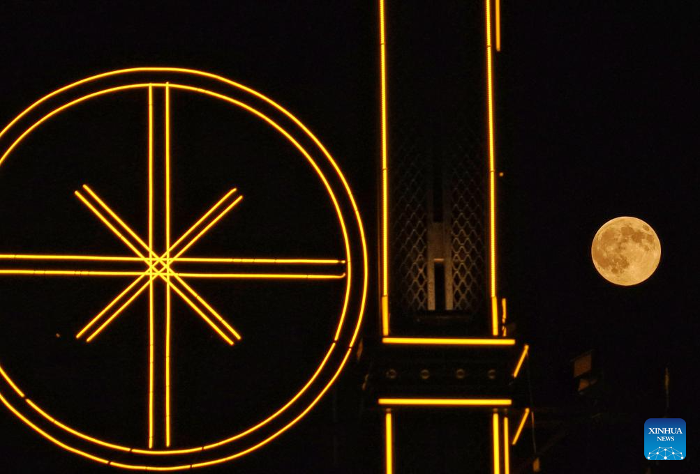 NANTONG, 5 noviembre, 2025 (Xinhua) -- Imagen tomada con un dron el 5 de noviembre de 2025 de una luna llena en el cielo sobre un letrero de neón, en Nantong, en la provincia de Jiangsu, en el este de China, el 5 de noviembre de 2025. Los observadores lunares podrán ver la luna llena más grande y brillante de 2025 cuando la Luna alcance su punto más cercano a la Tierra a las 21:19 (hora de Beijing) el miércoles. (Xinhua/Xu Congjun)