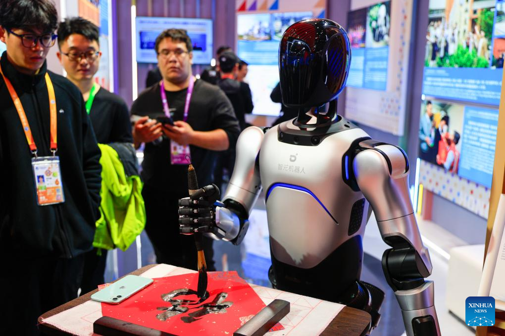 SHANGHAI, 5 noviembre, 2025 (Xinhua) -- Un robot escribe el carácter "fu" (que significa "buena suerte") en el Pabellón de China durante la VIII Exposición Internacional de Importaciones de China (CIIE, por sus siglas en inglés), en Shanghai, en el este de China, el 5 de noviembre de 2025. La VIII CIIE se inauguró el miércoles en Shanghai. Entre los aspectos más destacados del Pabellón de China se incluyen los últimos logros de China en la profundización integral de la reforma y la apertura de alto nivel durante el período del XIV Plan Quinquenal (2021-2025). (Xinhua/Liu Jiaqi)