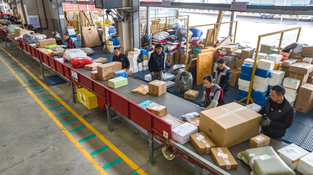 BEIJING, 10 noviembre, 2025 (Xinhua) -- Imagen tomada con un dron el 10 de noviembre de 2025 de empleados trabajando en una línea de clasificación de paquetes de una compañía exprés, en Anshun, en la provincia de Guizhou, en el suroeste de China. Las compañías de comercio electrónico y logística a lo largo de China se encuentran ocupadas vendiendo, empaquetando y entregando mercancía en vísperas del festival anual de compras "Doble Once", que cae el 11 de noviembre. (Xinhua/Chen Xi)