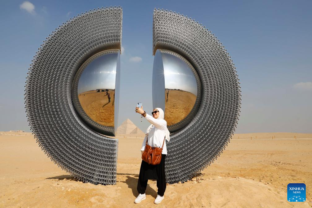 EL CAIRO, 11 noviembre, 2025 (Xinhua) -- Una visitante se toma una fotografía frente a una obra de arte exhibida durante la exposición internacional de arte "Por Siempre es Ahora" en el punto escénico de las Pirámides de Giza, en Giza, Egipto, el 11 de noviembre de 2025. La quinta edición de la exposición internacional de arte "Por Siempre es Ahora" comenzó el martes en el área del punto escénico de las Pirámides de Giza de Egipto, presentando 10 obras de artistas de diferentes países. (Xinhua/Ahmed Gomaa)