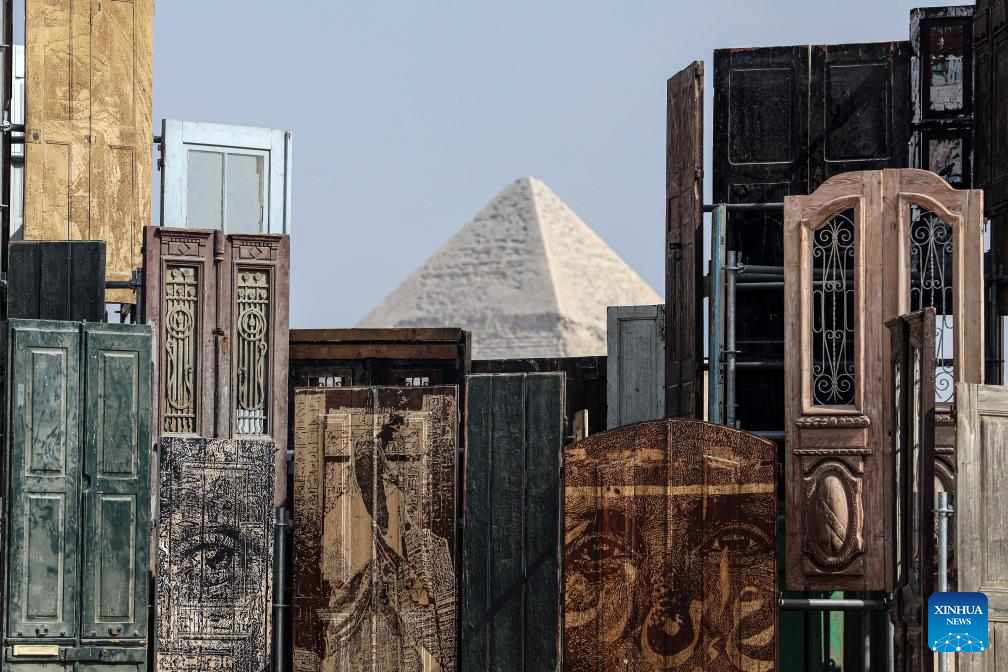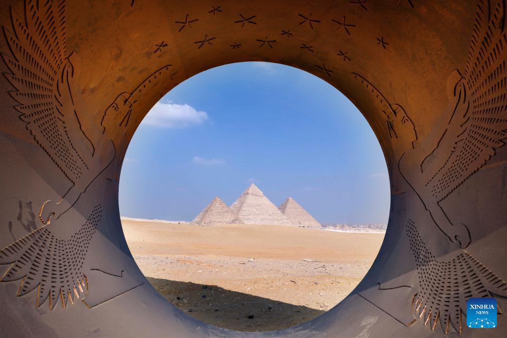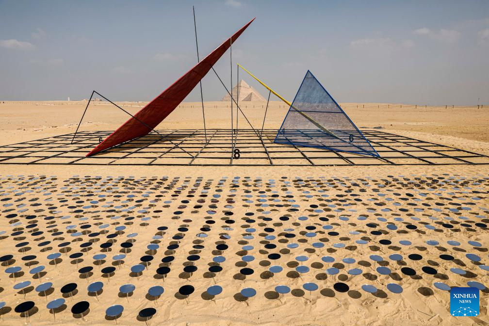 EL CAIRO, 11 noviembre, 2025 (Xinhua) -- Una instalación artística es exhibida durante la exposición internacional de arte "Por Siempre es Ahora" en el punto escénico de las Pirámides de Giza, en Giza, Egipto, el 11 de noviembre de 2025. La quinta edición de la exposición internacional de arte "Por Siempre es Ahora" comenzó el martes en el área del punto escénico de las Pirámides de Giza de Egipto, presentando 10 obras de artistas de diferentes países. (Xinhua/Ahmed Gomaa)
