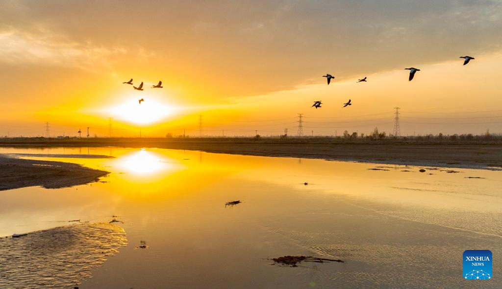 SHIZUISHAN, 12 noviembre, 2025 (Xinhua) -- Vista aérea tomada con un dron el 11 de noviembre de 2025 de aves migratorias volando sobre el Parque Nacional de Humedales Tianhewan, en el distrito de Pingluo de Shizuishan, en la región autónoma de la etnia hui de Ningxia, en el noroeste de China. Ubicado en el distrito de Pingluo, Ningxia, y adyacente al río Amarillo, el Parque Nacional de Humedales Tianhewan constituye una importante barrera ecológica en la cuenca del río Amarillo. (Xinhua/Yang Zhisen)