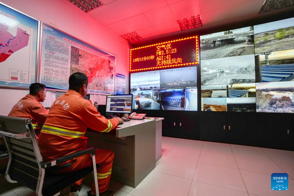 SHIZUISHAN, 12 noviembre, 2025 (Xinhua) -- Imagen del 11 de noviembre de 2025 de trabajadores operando una plataforma de monitoreo inteligente en el Parque Nacional de Humedales Tianhewan, en el distrito de Pingluo de Shizuishan, en la región autónoma hui de Ningxia, en el noroeste de China. Ubicado en el distrito de Pingluo, Ningxia, y adyacente al río Amarillo, el Parque Nacional de Humedales Tianhewan constituye una importante barrera ecológica en la cuenca del río Amarillo. (Xinhua/Yang Zhisen)