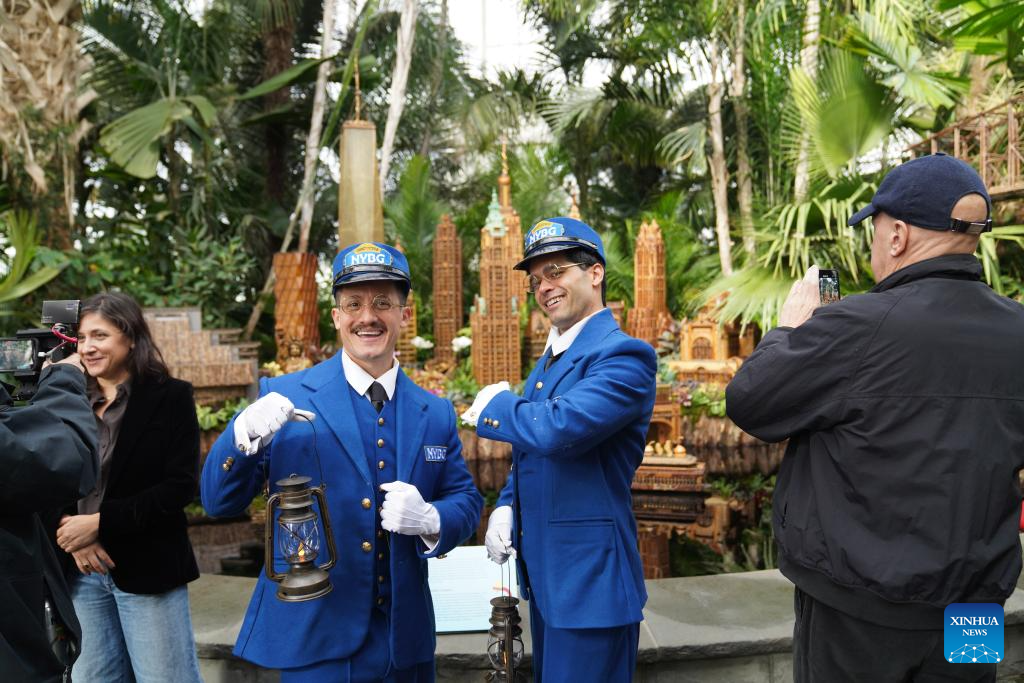 NUEVA YORK, 12 noviembre, 2025 (Xinhua) -- Imagen del 11 de noviembre de 2025 de trabajadores vestidos como conductores de tren recibiendo a los visitantes frente a las maquetas de los edificios de Manhattan durante la vista previa de la Exposición de Trenes Navideños, en el Jardín Botánico de Nueva York, en Nueva York, Estados Unidos. Una vista previa de la Exposición de Trenes Navideños se llevó a cabo el martes presentando maquetas de trenes a escala que circulan por una Ciudad de Nueva York en miniatura. (Xinhua/Zhang Fengguo)