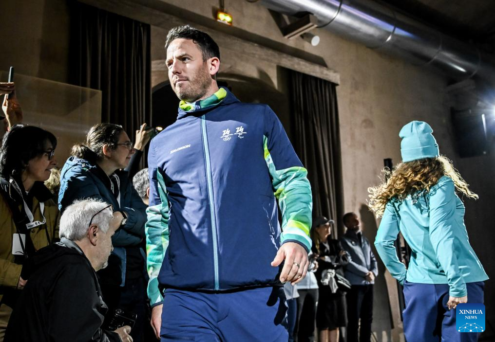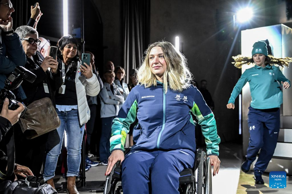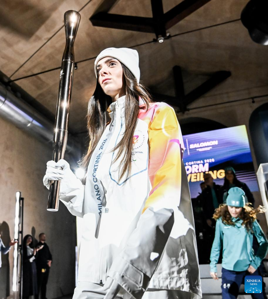 MILAN, 13 noviembre, 2025 (Xinhua) -- Imagen del 12 de noviembre de 2025 de una trabajadora presentando los uniformes oficiales de los portadores de la antorcha durante un evento de develación de los uniformes oficiales para los voluntarios, los trabajadores del Comité Organizador y los portadores de la antorcha de los Juegos Olímpicos y Paralímpicos de Invierno de Milán Cortina 2026, en Milán, Italia. (Xinhua)