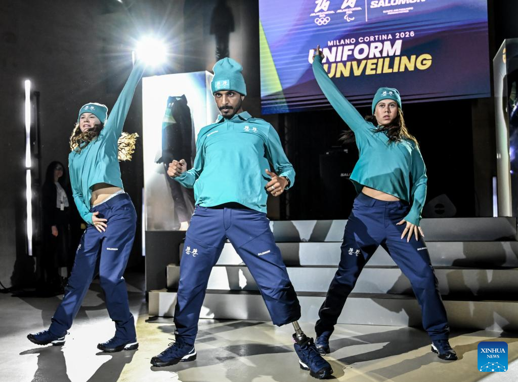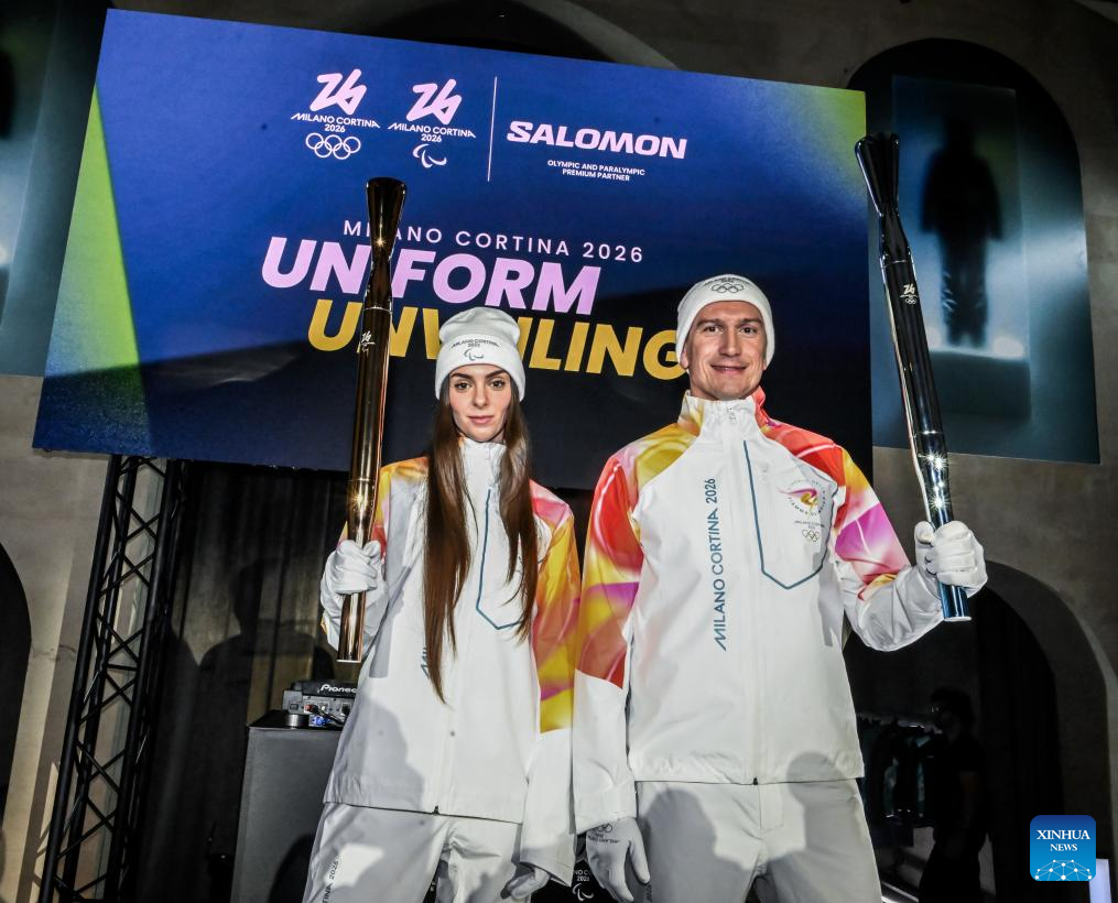 MILAN, 13 noviembre, 2025 (Xinhua) -- Imagen del 12 de noviembre de 2025 de trabajadores presentando los uniformes oficiales de los portadores de la antorcha durante un evento de develación de los uniformes oficiales para los voluntarios, los trabajadores del Comité Organizador y los portadores de la antorcha de los Juegos Olímpicos y Paralímpicos de Invierno de Milán Cortina 2026, en Milán, Italia. (Xinhua)