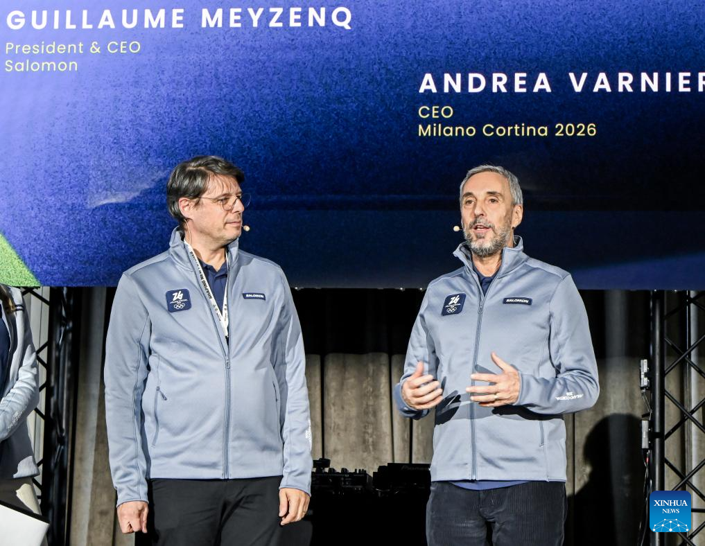 MILAN, 13 noviembre, 2025 (Xinhua) -- Imagen del 12 de noviembre de 2025 de Andrea Varnier (d), director ejecutivo de Milán Cortina 2026, hablando durante un evento de develación de los uniformes oficiales para los voluntarios, los trabajadores del Comité Organizador y los portadores de la antorcha de los Juegos Olímpicos y Paralímpicos de Invierno de Milán Cortina 2026, en Milán, Italia. (Xinhua)