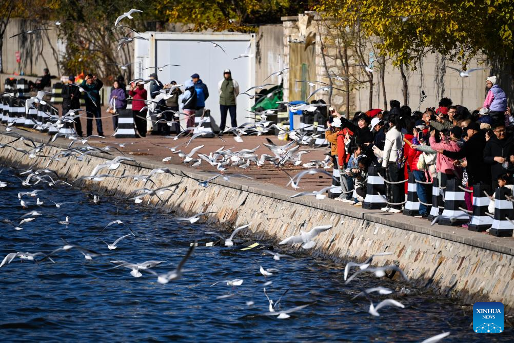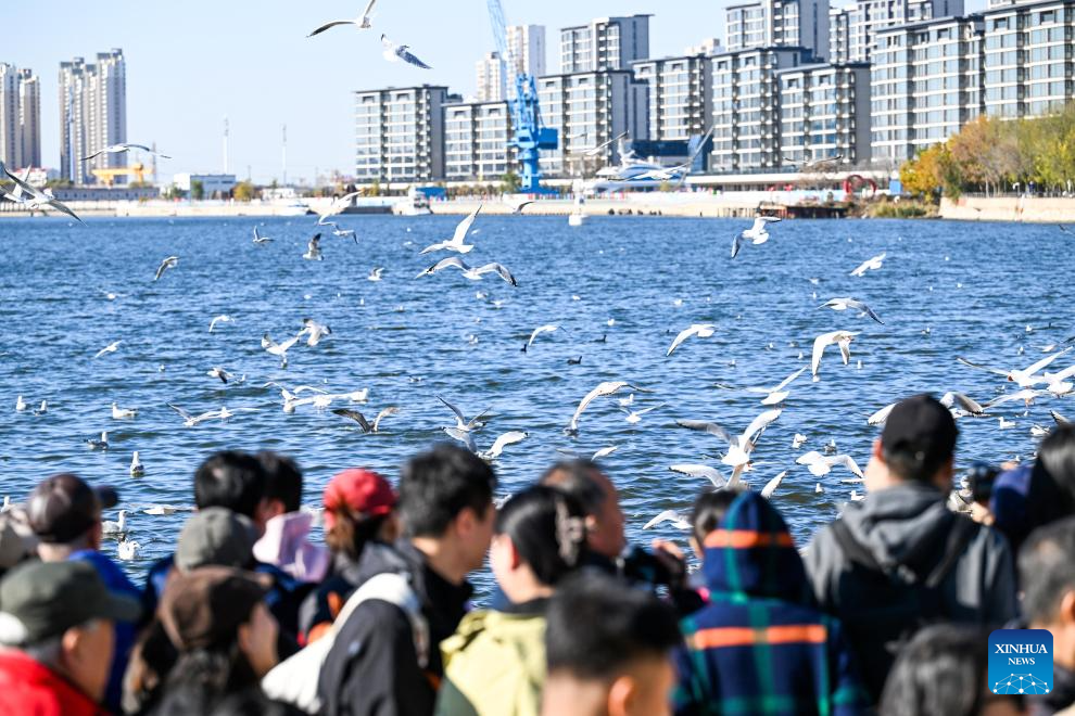 TIANJIN, 13 noviembre, 2025 (Xinhua) -- Personas observan gaviotas junto al río Haihe, en la municipalidad de Tianjin, en el norte de China, el 13 de noviembre de 2025. Miles de gaviotas se han congregado recientemente en un muelle junto al río Haihe, convirtiéndolo en una atracción turística. (Xinhua/Zhao Zishuo)