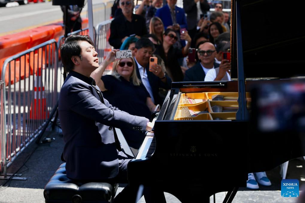 LOS ANGELES, 11 abril, 2024 (Xinhua) -- Imagen del 10 de abril de 2024 del pianista chino Lang Lang realizando una interpretación en su ceremonia del Paseo de la Fama de Hollywood, en los Angeles, California, Estados Unidos. El pianista chino Lang Lang fue honrado con una estrella en el Paseo de la Fama de Hollywood en Los Angeles el miércoles, en la categoría de interpretación en vivo. (Xinhua)