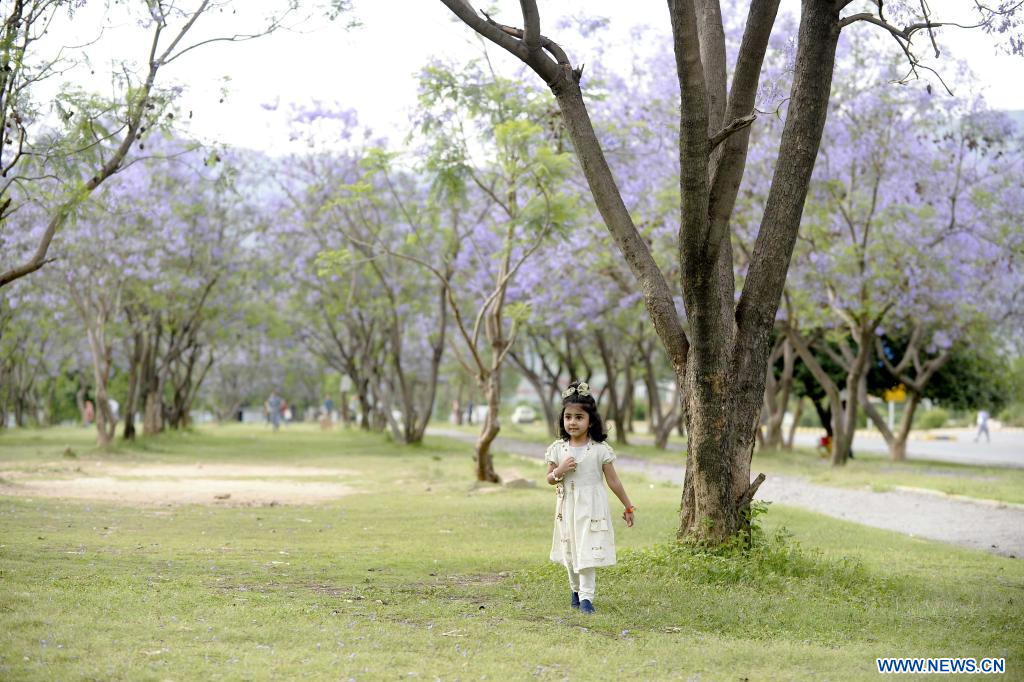 ISLAMABAD, 2 mayo, 2024 (Xinhua) -- Una niña juega bajo árboles de jacaranda floreciendo, en Islamabad, Pakistán, el 2 de mayo de 2024. (Xinhua/Ahmad Kamal)