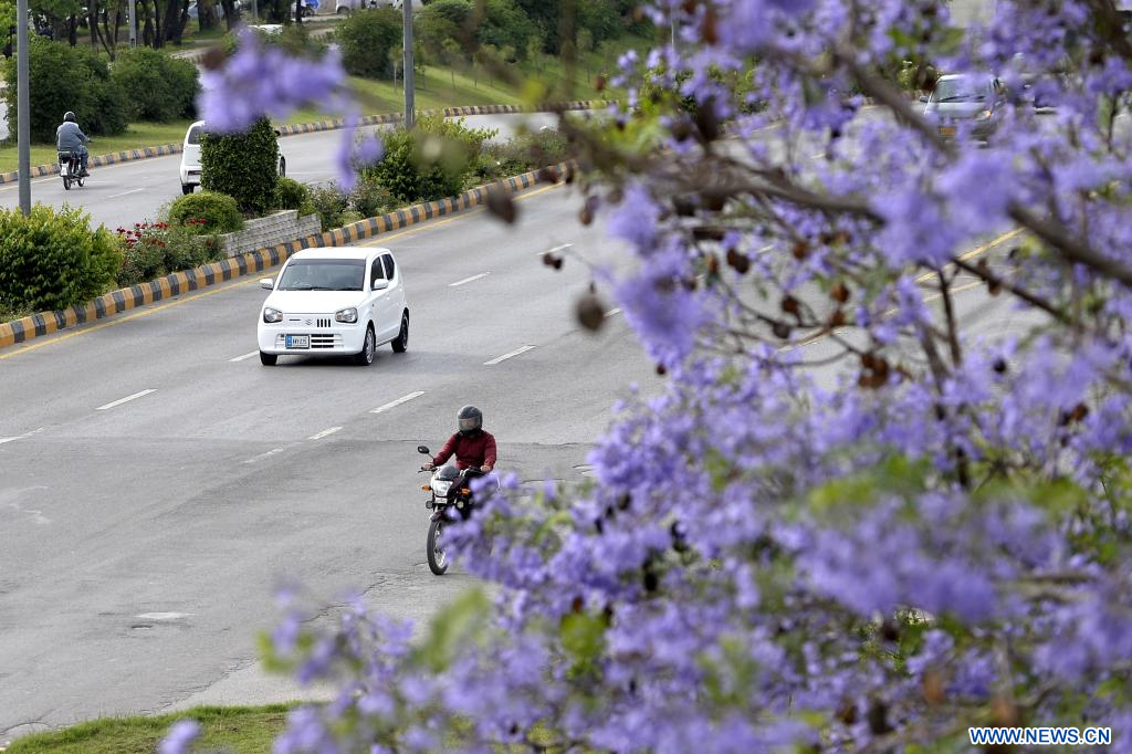 ISLAMABAD, 2 mayo, 2024 (Xinhua) -- Arboles de jacaranda floreciendo son vistos al borde del camino, en Islamabad, Pakistán, el 2 de mayo de 2024. (Xinhua/Ahmad Kamal)