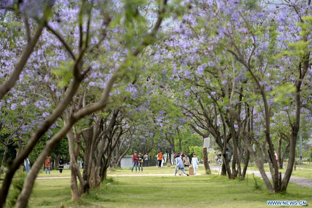 ISLAMABAD, 2 mayo, 2024 (Xinhua) -- Personas disfrutan de su tiempo libre bajo árboles de jacaranda floreciendo, en Islamabad, Pakistán, el 2 de mayo de 2024. (Xinhua/Ahmad Kamal)