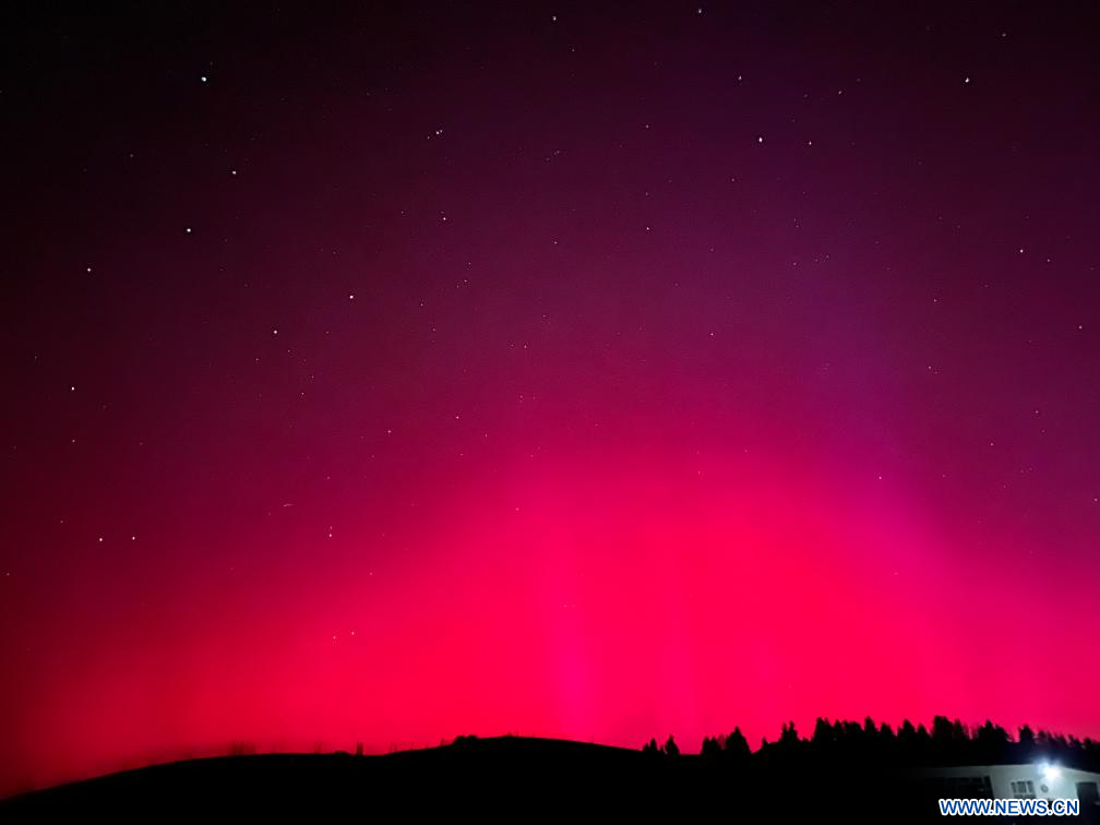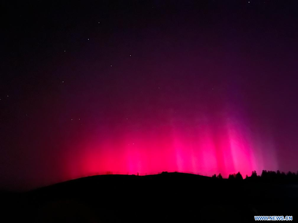 URUMQI, 11 mayo, 2024 (Xinhua) -- Imagen tomada con un teléfono móvil del 11 de mayo de 2024 de auroras boreales cerca del punto escénico de Nanshan, en Urumqi, capital de la región autónoma uygur de Xinjiang, en el noroeste de China. (Xinhua/Chen Shuo)