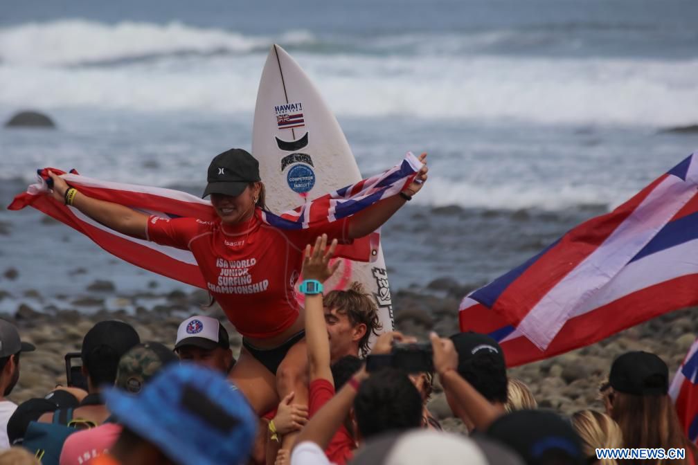 LA LIBERTAD, 12 mayo, 2024 (Xinhua) -- Vahiti Inso (arriba), de Hawái, festeja el primer lugar en la categoría Sub-18 femenino durante la final del Campeonato Mundial Juvenil de Surf 2024 organizado por la Asociación Internacional de Surf (ISA, por sus siglas en inglés) en la playa La Bocana, en el departamento de La Libertad, El Salvador, el 12 de mayo de 2024. (Xinhua/Alexander Peña)