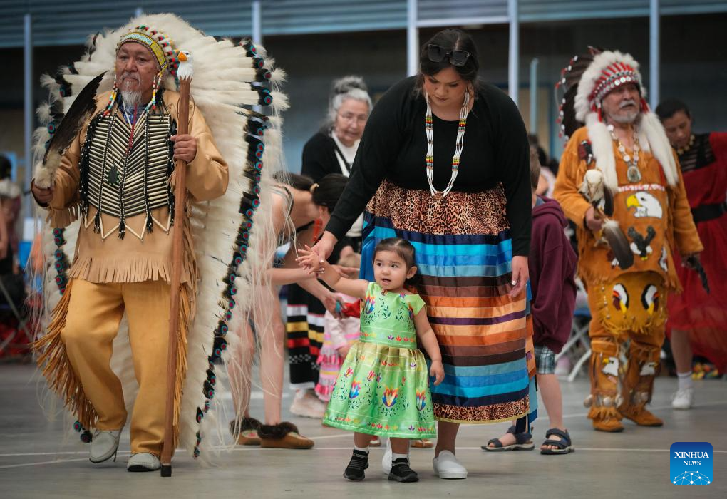 VANCOUVER, 13 mayo, 2024 (Xinhua) -- Imagen del 12 de mayo de 2024 de una niña acompañada de su madre participando en el Powwow Tradicional del Día de las Madres, en Vancouver, Columbia Británica, Canadá. Cientos de indígenas de varias tribus de Canadá se reunieron el domingo para celebrar el Día de las Madres con un powwow, una reunión social tradicional con música y danza. (Xinhua/Liang Sen)
