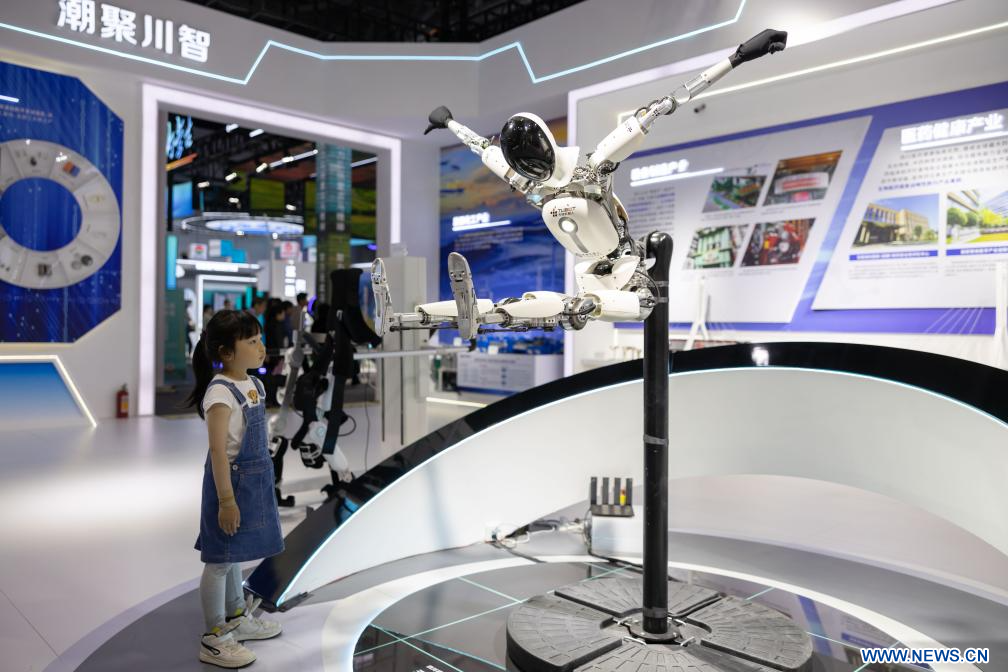 SHANGHAI, 12 mayo, 2024 (Xinhua) -- Una niña observa la presentación de un robot en el estand de la provincia de Sichuan, en el suroeste de China, durante una exposición de marcas chinas de los eventos por el Día de la Marca de China 2024, en Shanghai, en el este de China, el 12 de mayo de 2024. Los eventos del Día de la Marca de China 2024 comenzaron el viernes en Shanghai, mientras el país continua con sus esfuerzos para promover la creación de marcas. Los eventos, con el tema "mejor calidad, futuro brillante para las marcas chinas", comprenden una ceremonia de apertura, un foro sobre el desarrollo de la marca de China, una exposición de marcas chinas y otras actividades de creación de marca. (Xinhua/Wang Xiang)