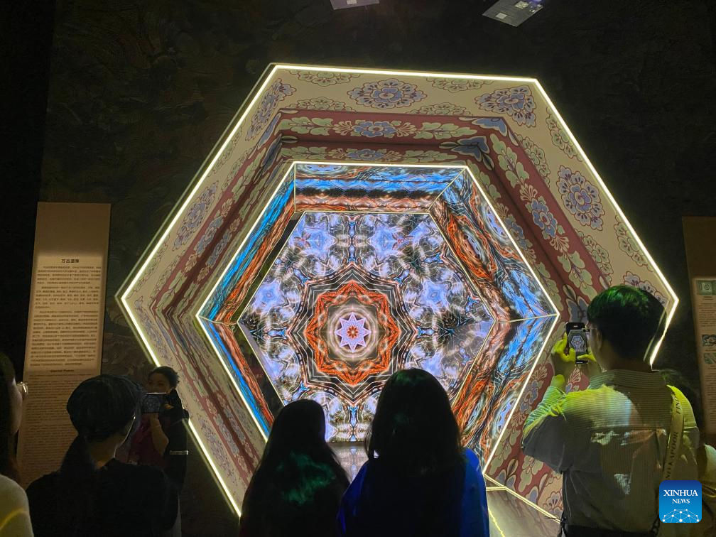 BEIJING, 13 mayo, 2024 (Xinhua) -- Imagen tomada con un teléfono móvil el 16 de abril de 2024 de visitantes observando la exposición "Magnificencia y grandeza: experiencia inmersiva del arte de las grutas" en el Museo Nacional de China, en Beijing, la capital de China. (Xinhua/Luo Xin)