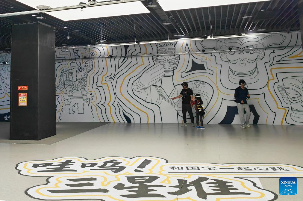 BEIJING, 13 mayo, 2024 (Xinhua) -- Imagen tomada con un teléfono móvil el 4 de mayo de 2024 de personas disfrutando de una exposición de experiencia inmersiva de Realidad Virtual llamada "¡Wow! Sanxingdui" en un centro comercial, en el distrito de Chaoyang, en Beijing, la capital de China. (Xinhua/Luo Xin)