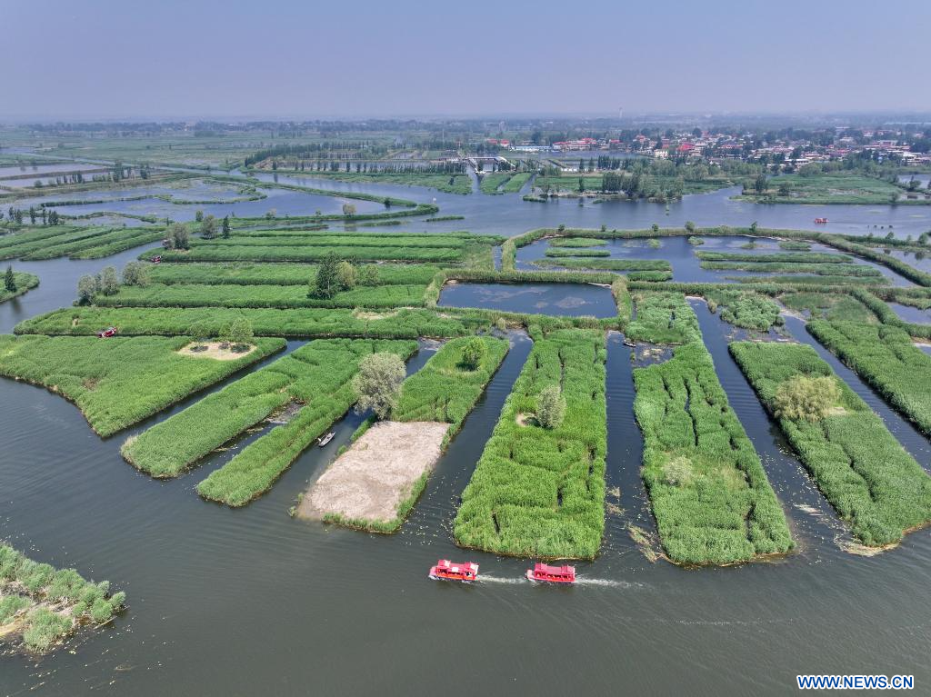 XIONG'AN, 9 mayo, 2024 (Xinhua) -- Vista aérea tomada con dron del 8 de mayo de 2024 de botes navegando en el lago Baiyangdian, en la Nueva Área de Xiong'an, en la provincia de Hebei, en el norte de China. Baiyangdian, el humedal de agua dulce más grande del norte de China, se localiza en la Nueva Área de Xiong'an en Hebei. Desde que la Nueva Área de Xiong'an fue establecida en 2017, las actividades de rehabilitación y protección del lago se han reforzado. A partir de 2023, la calidad del agua en Baiyangdian había mantenido Grado III en el sistema de calidad de cinco niveles del país durante tres años consecutivos. (Xinhua/Mu Yu)