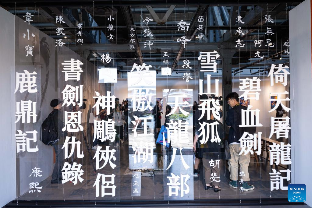 MACAO, 14 mayo, 2024 (Xinhua) -- Visitantes observan exhibiciones en la Exposición de Armas y Trajes Dramáticos Wuxia de Jin Yong, celebrada en Macao, en el sur de China, el 14 de mayo de 2024. Esta exposición revive las escenas icónicas de ocho renombrados dramas televisivos de wuxia del fallecido novelista chino de artes marciales Louis Cha Leung-yung, más conocido por su seudónimo Jin Yong. (Xinhua/Cheong Kam Ka)