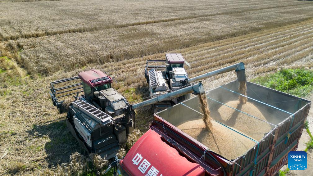 DAZHOU, 13 mayo, 2024 (Xinhua) -- Imagen tomada con un dron el 13 de mayo de 2024 de segadoras cosechando trigo en un campo, en el poblado de Guifu, en la ciudad de Dazhou, en la provincia de Sichuan, en el suroeste de China. (Xinhua/Deng Liangkui)