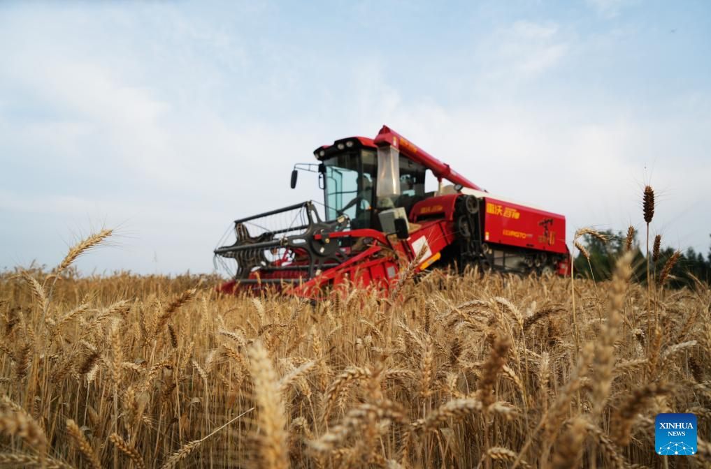 DAZHOU, 13 mayo, 2024 (Xinhua) -- Una segadora cosecha trigo en el campo en el poblado de Guifu, en la ciudad de Dazhou, en la provincia de Sichuan, en el suroeste de China, el 13 de mayo de 2024. (Xinhua/Deng Liangkui)