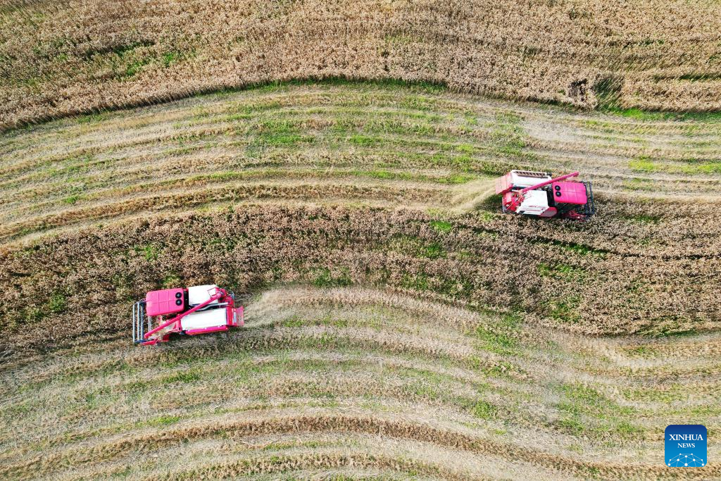 MEISHAN, 13 mayo, 2024 (Xinhua) -- Imagen tomada con un dron el 13 de mayo de 2024 de máquinas agrícolas cosechando trigo en un campo, en el distrito de Pengshan de la ciudad de Meishan, en la provincia de Sichuan, en el suroeste de China. (Xinhua/Weng Guangjian)