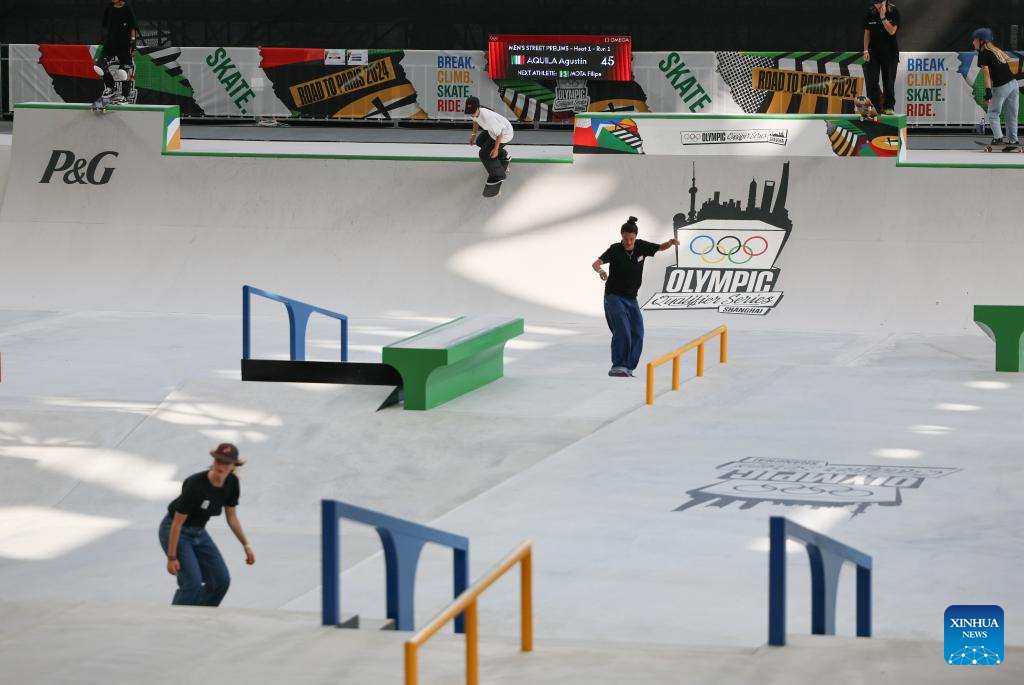 SHANGHAI, 15 mayo, 2024 (Xinhua) -- Patinadores practican previo a la Serie de Clasificación Olímpica de Shanghai, en Shanghai, en el este de China, el 15 de mayo de 2024. La Serie de Clasificación Olímpica de estilo libre de BMX, skateboarding, breaking y escalada deportiva se llevará a cabo en un parque urbano en la ribera de Huangpu del 16 al 19 de mayo de 2024. (Xinhua/Wang Xiang)