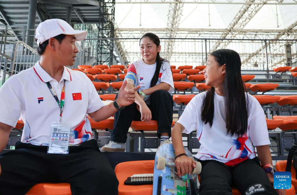SHANGHAI, 15 mayo, 2024 (Xinhua) -- Las patinadoras Zhang Yan (c), y Zheng Haohao (d), de China, conversan con su entrenador Wang Chongtian en un descanso de entrenamiento previo a la Serie de Clasificación Olímpica de Shanghai, en Shanghai, en el este de China, el 15 de mayo de 2024. La Serie de Clasificación Olímpica de estilo libre de BMX, skateboarding, breaking y escalada deportiva se llevará a cabo en un parque urbano en la ribera de Huangpu del 16 al 19 de mayo de 2024. (Xinhua/Wang Kaiyan)