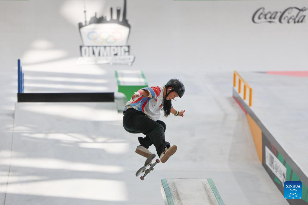 SHANGHAI, 15 mayo, 2024 (Xinhua) -- La patinadora Zhang Yan, de China, practica previo a la Serie de Clasificación Olímpica de Shanghai, en Shanghai, en el este de China, el 15 de mayo de 2024. La Serie de Clasificación Olímpica de estilo libre de BMX, skateboarding, breaking y escalada deportiva se llevará a cabo en un parque urbano en la ribera de Huangpu del 16 al 19 de mayo de 2024. (Xinhua/Wang Kaiyan)
