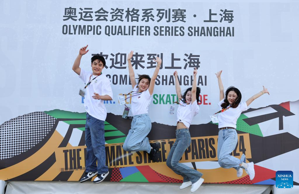 SHANGHAI, 15 mayo, 2024 (Xinhua) -- Voluntarios posan para una fotografía en el parque previo a la Serie de Clasificación Olímpica de Shanghai, en Shanghai, en el este de China, el 15 de mayo de 2024. La Serie de Clasificación Olímpica de estilo libre de BMX, skateboarding, breaking y escalada deportiva se llevará a cabo en un parque urbano en la ribera de Huangpu del 16 al 19 de mayo de 2024. (Xinhua/Wang Kaiyan)
