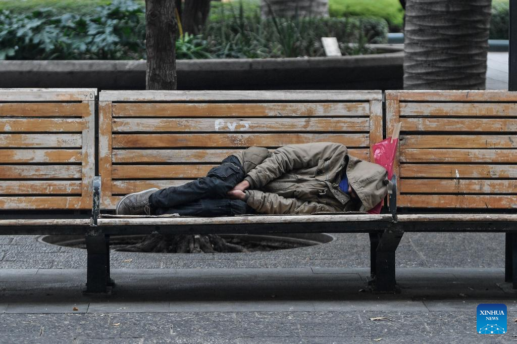 SANTIAGO, 15 mayo, 2024 (Xinhua) -- Una persona porta ropa abrigadora mientras descansa en una banca durante una ola de frío, en Santiago, capital de Chile, el 15 de mayo de 2024. (Xinhua/Jorge Villegas)
