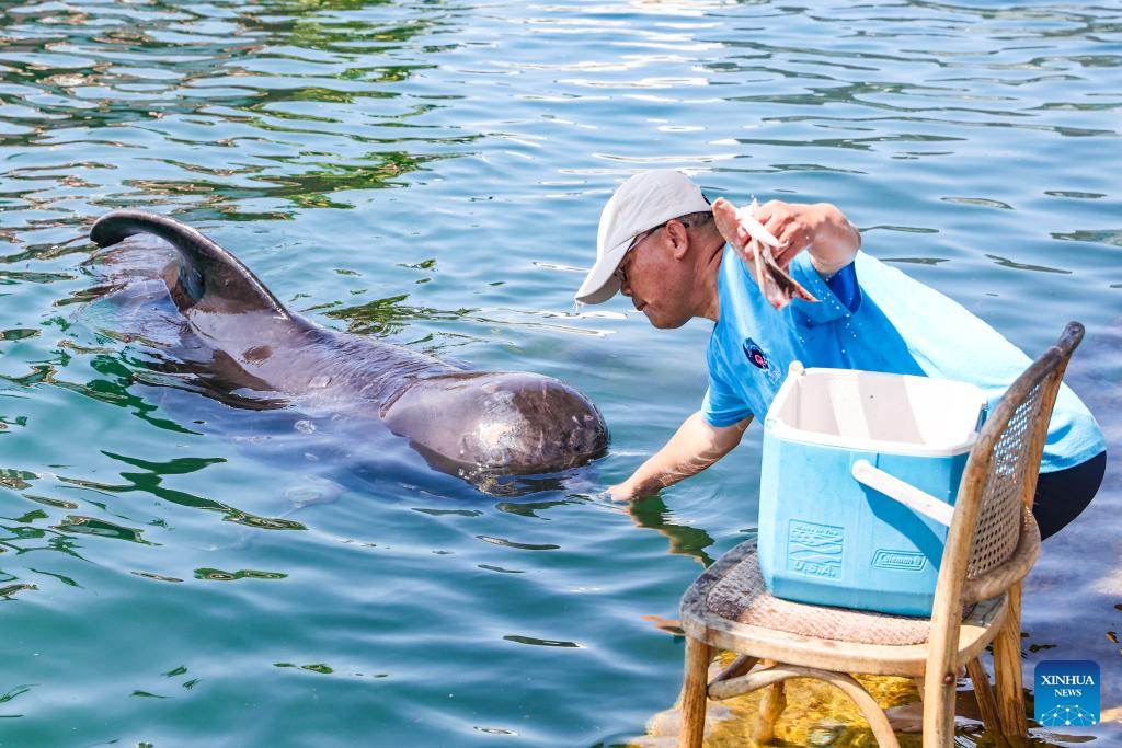 HAIKOU, 16 mayo, 2024 (Xinhua) -- Imagen del 15 de mayo de 2024 de un trabajador del Centro de Conservación Animal Haichang de Sanya alimentando a la ballena piloto de aleta corta "Haitang", en Sanya, en la provincia de Hainan, en el sur de China. La recientemente rescatada ballena piloto de aleta corta "Haitang" se recupera bien en Sanya y se espera que sea liberada en el océano en mayo con base en las condiciones climáticas y del mar, según los expertos. (Xinhua/Zhang Liyun)