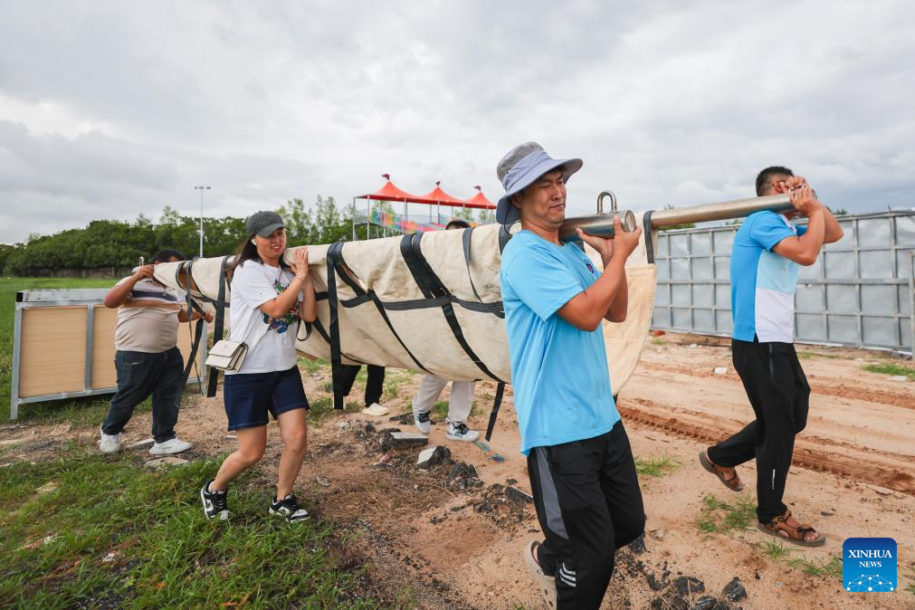 HAIKOU, 16 mayo, 2024 (Xinhua) -- Imagen del 15 de mayo de 2024 de trabajadores de la Asociación de Conservación del Océano Blue Ribbon y el Centro de Conservación Animal Haichang de Sanya cargando una camilla utilizada para transportar a la ballena piloto de aleta corta "Haitang", en Sanya, en la provincia de Hainan, en el sur de China. La recientemente rescatada ballena piloto de aleta corta "Haitang" se recupera bien en Sanya y se espera que sea liberada en el océano en mayo con base en las condiciones climáticas y del mar, según los expertos. (Xinhua/Zhang Liyun)