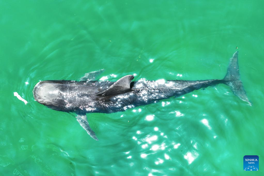 HAIKOU, 16 mayo, 2024 (Xinhua) -- Vista aérea tomada con un dron el 15 de mayo de 2024 de la ballena piloto de aleta corta "Haitang" comiendo en el Centro de Conservación Animal Haichang de Sanya, en Sanya, en la provincia de Hainan, en el sur de China. La recientemente rescatada ballena piloto de aleta corta "Haitang" se recupera bien en Sanya y se espera que sea liberada en el océano en mayo con base en las condiciones climáticas y del mar, según los expertos. (Xinhua/Zhang Liyun)