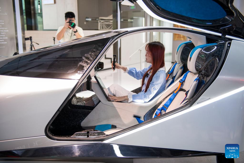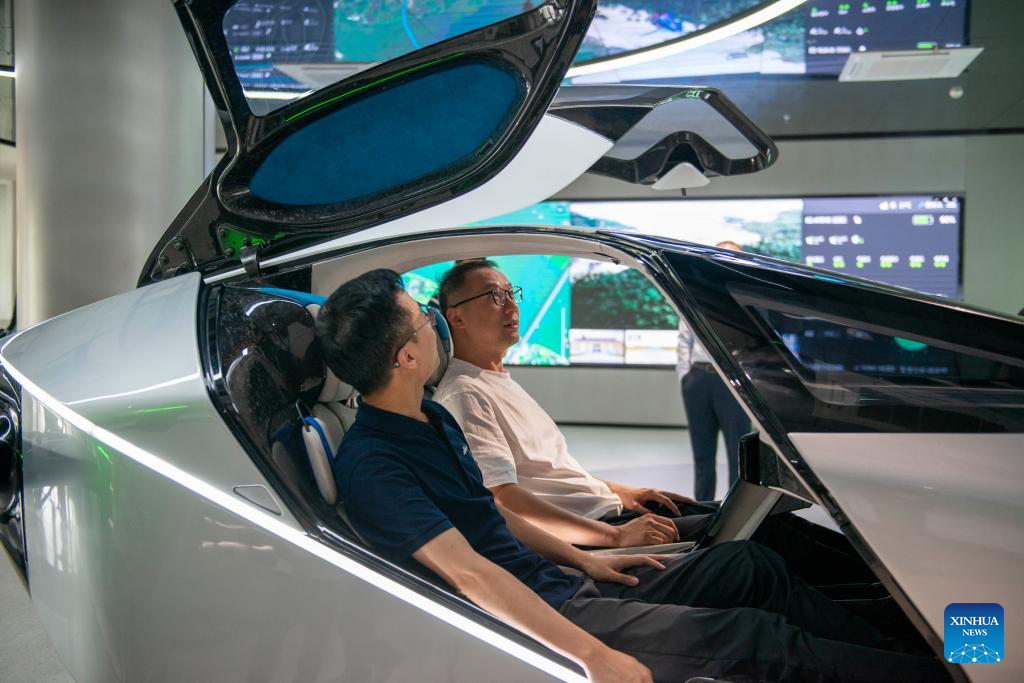 GUANGZHOU, 16 mayo, 2024 (Xinhua) -- Imagen del 15 de mayo de 2024 de visitantes probando un vehículo volador Xpeng X2 en la sede de Xpeng Aeroht, en el distrito de Panyu de Guangzhou, en la provincia de Guangdong, en el sur de China. La economía de baja altitud está emergiendo como precursora en el desarrollo de nuevas fuerzas productivas de calidad en toda China. En los últimos años, con la mejora de la infraestructura y el espacio aéreo de baja altitud, empresas de tecnología como EHang y Xpeng Aeroht han surgido en Guangzhou, ofreciendo productos y soluciones de vehículos aéreos para muchas industrias en todo el mundo, e inyectando un nuevo impulso al desarrollo económico de alta calidad. (Xinhua/Xu Jiayi)