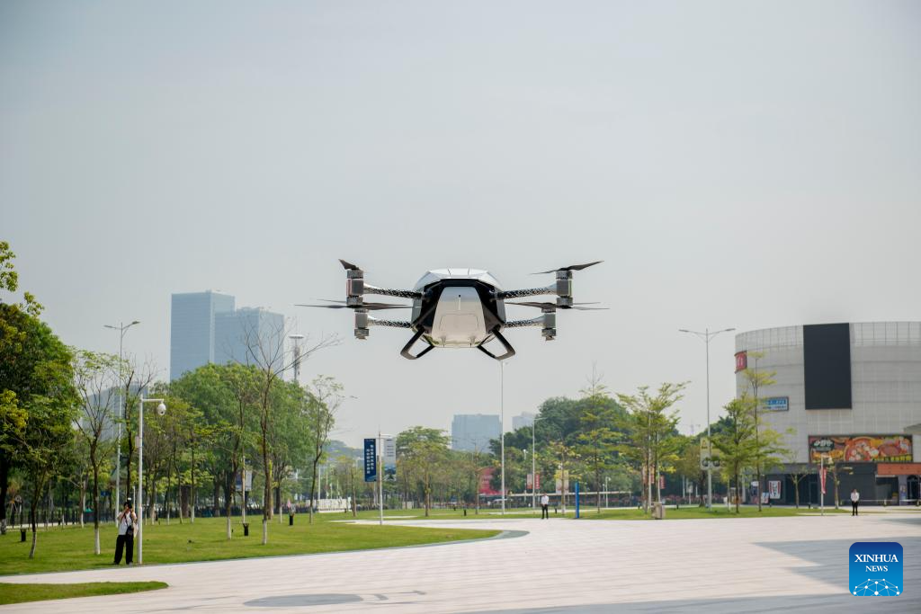 GUANGZHOU, 16 mayo, 2024 (Xinhua) -- Imagen del 15 de mayo de 2024 de un vehículo volador Xpeng X2 visto durante un vuelo de demostración en la sede de Xpeng Aeroht, en el distrito de Panyu de Guangzhou, en la provincia de Guangdong, en el sur de China. La economía de baja altitud está emergiendo como precursora en el desarrollo de nuevas fuerzas productivas de calidad en toda China. En los últimos años, con la mejora de la infraestructura y el espacio aéreo de baja altitud, empresas de tecnología como EHang y Xpeng Aeroht han surgido en Guangzhou, ofreciendo productos y soluciones de vehículos aéreos para muchas industrias en todo el mundo, e inyectando un nuevo impulso al desarrollo económico de alta calidad. (Xinhua/Xu Jiayi)