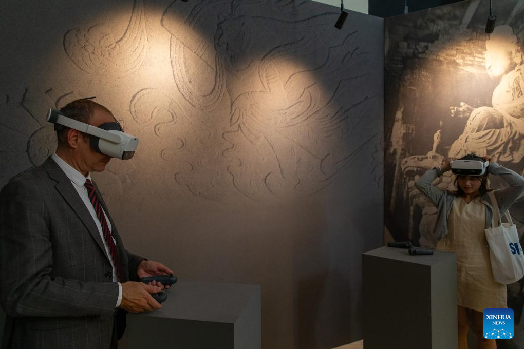 ATENAS, 14 mayo, 2024 (Xinhua) -- Imagen del 11 de mayo de 2024 de un visitante utilizando un dispositivo de realidad virtual para observar el arte de las grutas chinas en el Salón Zappeion, en Atenas, Grecia. La Exposición Itinerante Internacional de la Restauración Digital de las Grutas de la Montaña Tianlong se celebró en Atenas y atrajo a muchos visitantes. (Xinhua/Marios Lolos)