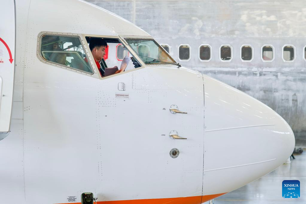 HAIKOU, 14 mayo, 2024 (Xinhua) -- Imagen del 13 de mayo de 2024 de trabajadores de Grand China Aviation Maintenance Co., Ltd. (GCAM, por sus siglas en inglés) operando dentro de la cabina de vuelo de un avión de llegada en un hangar de una base de mantenimiento de aeronaves, en Haikou, en la provincia de Hainan, en el sur de China. Un avión Boeing 737-800 de Jeju Air de República de Corea ha sido recientemente sometido a mantenimiento por parte de GCAM, que también el primer pedido para el mantenimiento de aviones de llegada desde República de Corea en el Puerto de Libre Comercio de Hainan. El servicio se espera que dure aproximadamente 16 días, elegible para tratamientos preferenciales del puerto de libre comercio incluida la exención del depósito en efectivo así como los suministros de combustible y mantenimiento libres de impuestos. (Xinhua/Zhang Liyun)