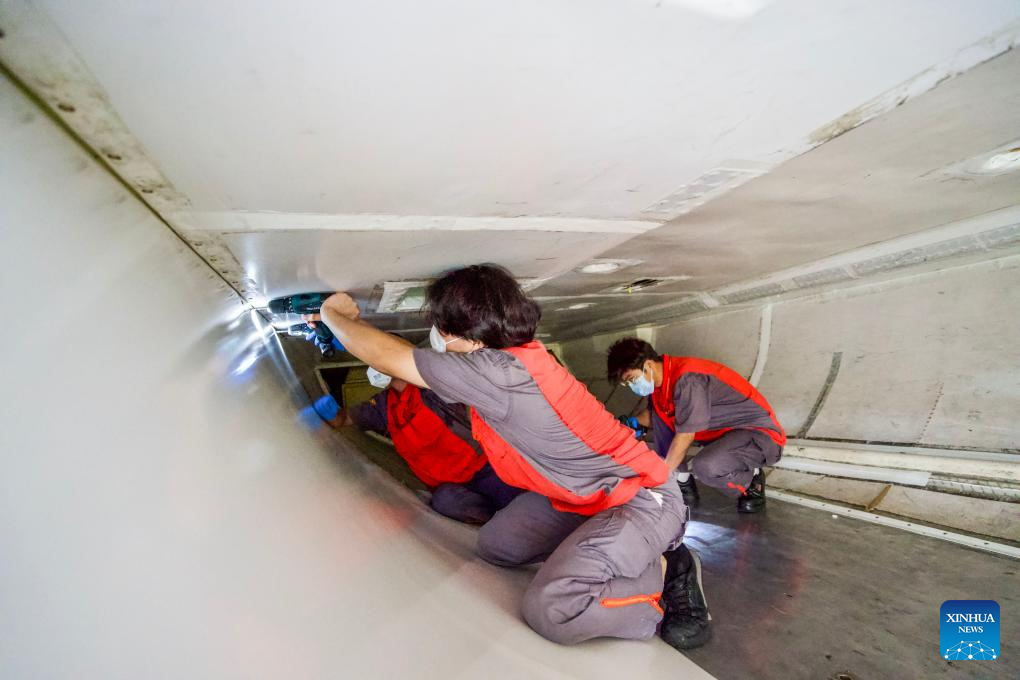 HAIKOU, 14 mayo, 2024 (Xinhua) -- Imagen del 13 de mayo de 2024 de trabajadores de Grand China Aviation Maintenance Co., Ltd. (GCAM, por sus siglas en inglés) operando dentro de la bodega de carga de un avión de llegada en un hangar de una base de mantenimiento de aeronaves, en Haikou, en la provincia de Hainan, en el sur de China. Un avión Boeing 737-800 de Jeju Air de República de Corea ha sido recientemente sometido a mantenimiento por parte de GCAM, que también el primer pedido para el mantenimiento de aviones de llegada desde República de Corea en el Puerto de Libre Comercio de Hainan. El servicio se espera que dure aproximadamente 16 días, elegible para tratamientos preferenciales del puerto de libre comercio incluida la exención del depósito en efectivo así como los suministros de combustible y mantenimiento libres de impuestos. (Xinhua/Zhang Liyun)