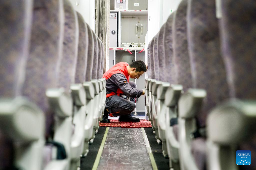 HAIKOU, 14 mayo, 2024 (Xinhua) -- Imagen del 13 de mayo de 2024 de un trabajador de Grand China Aviation Maintenance Co., Ltd. (GCAM, por sus siglas en inglés) operando dentro de la cabina de pasajeros de un avión de llegada en un hangar de una base de mantenimiento de aeronaves, en Haikou, en la provincia de Hainan, en el sur de China. Un avión Boeing 737-800 de Jeju Air de República de Corea ha sido recientemente sometido a mantenimiento por parte de GCAM, que también el primer pedido para el mantenimiento de aviones de llegada desde República de Corea en el Puerto de Libre Comercio de Hainan. El servicio se espera que dure aproximadamente 16 días, elegible para tratamientos preferenciales del puerto de libre comercio incluida la exención del depósito en efectivo así como los suministros de combustible y mantenimiento libres de impuestos. (Xinhua/Zhang Liyun)